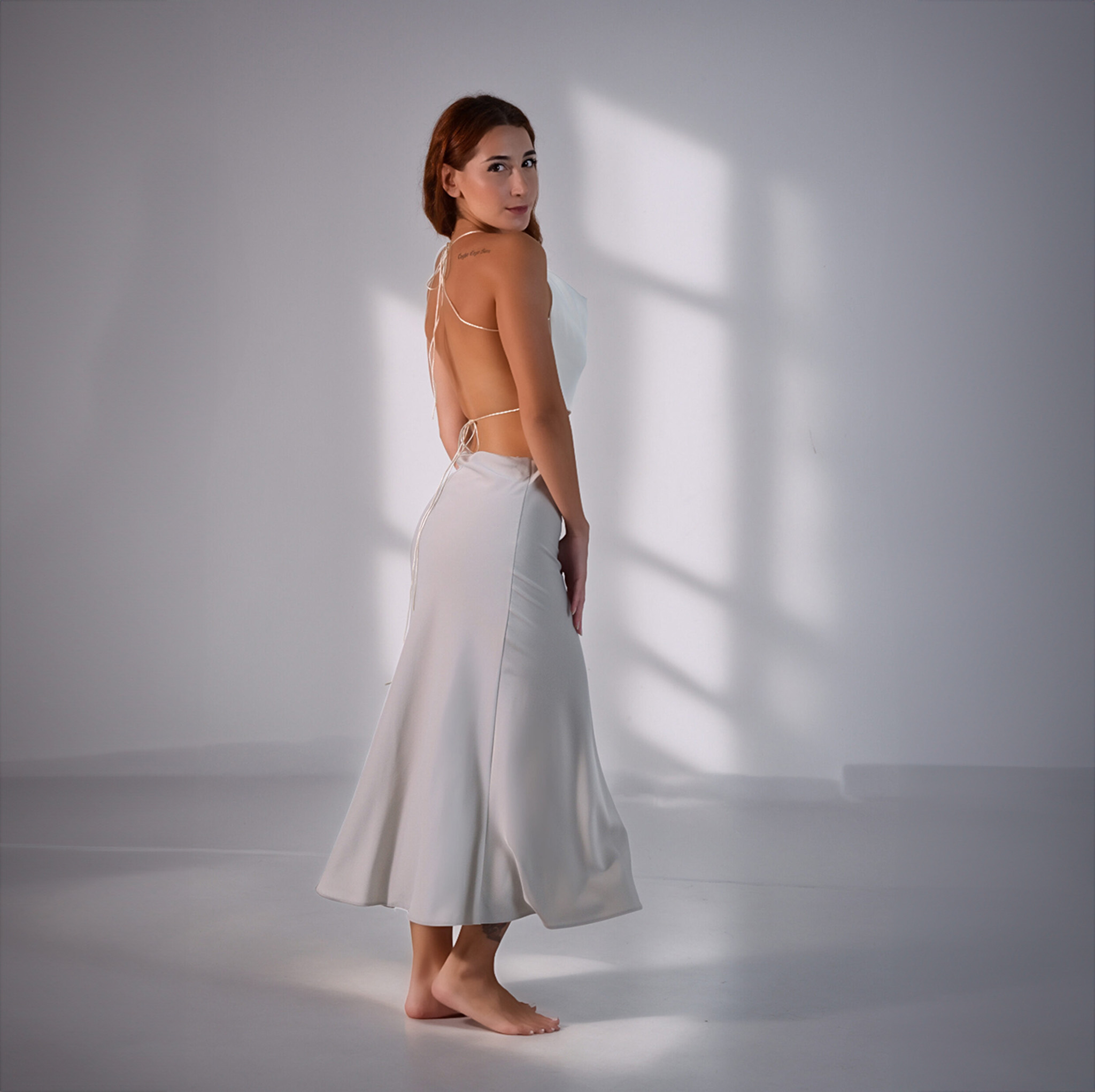 Fluid white maxi skirt with a soft drape and minimalist charm.